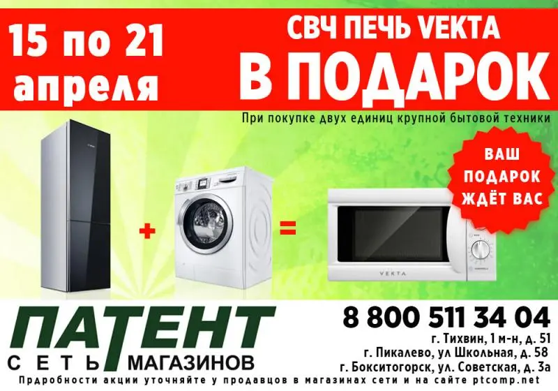 При покупке двух единиц крупной бытовой техники* - свч печь в подарок! Спешите, количество подарков - ограничено
