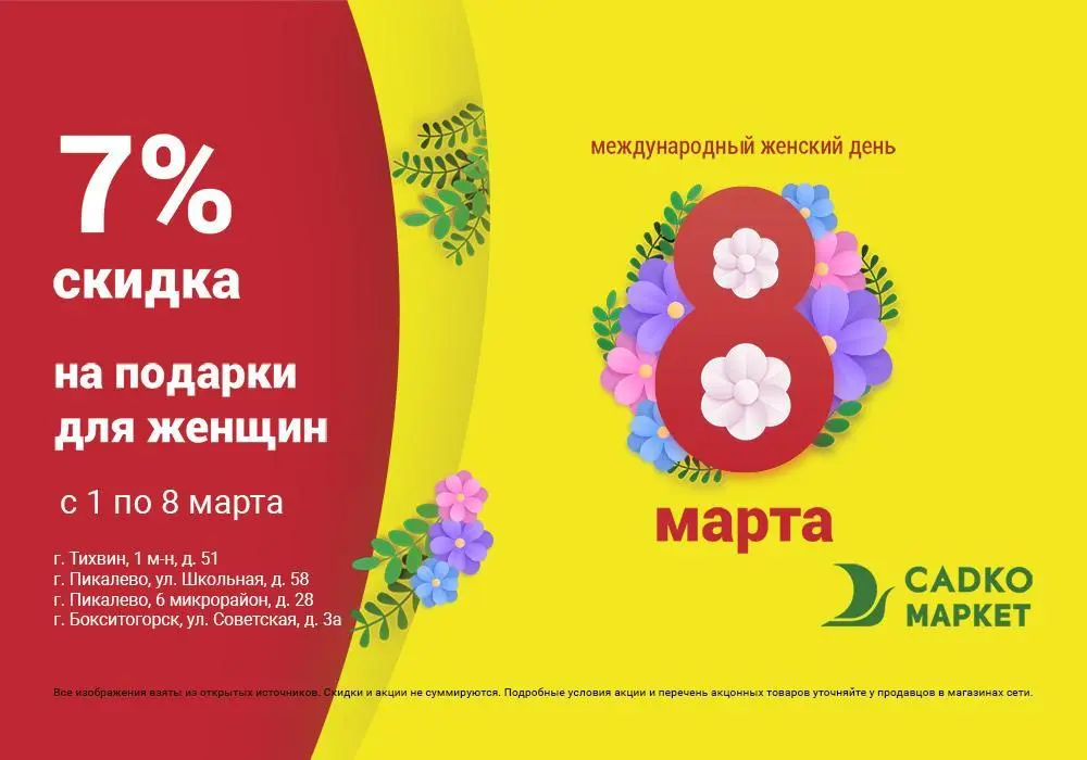 С 1 по 8 марта 2022 скидка 7% на подарки для женщин в Садко Маркет!
